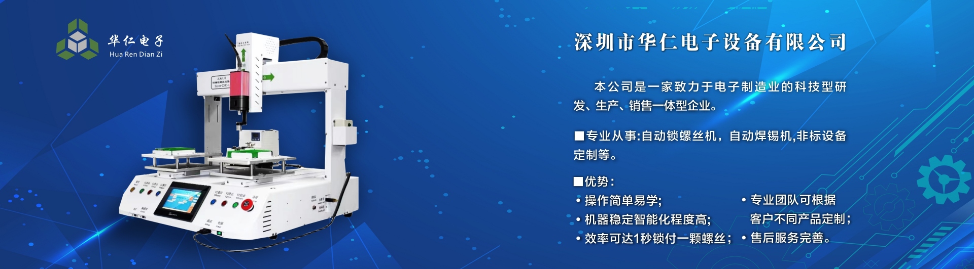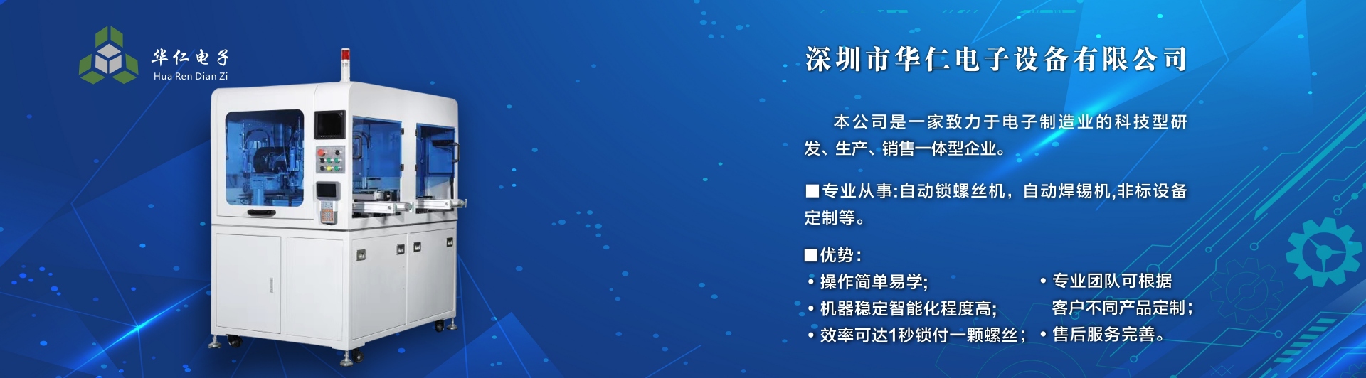 深圳市華仁電子設(shè)備有限公司是一家致力于電子制造業(yè)周邊設(shè)備的科技型研發(fā)、生產(chǎn)、銷售一體的企業(yè),專業(yè)從事:自動(dòng)鎖螺絲機(jī);自動(dòng)焊錫機(jī);非標(biāo)設(shè)備定制機(jī)等,公司長(zhǎng)期以來在行業(yè)中積累了豐富的經(jīng)驗(yàn),擁有專業(yè)的研發(fā)、技術(shù)、銷售支持工程團(tuán)隊(duì)、各高級(jí)技術(shù)人才為客戶提供優(yōu)質(zhì)產(chǎn)品和服務(wù),同時(shí)不斷吸取國(guó)內(nèi)外先進(jìn)技術(shù),更準(zhǔn)確及時(shí)地為客戶提供優(yōu)質(zhì),性價(jià)比高的產(chǎn)品、公司以專業(yè)的售前、售中、售后服務(wù)贏得了客戶的信賴和好評(píng),為客戶提供先進(jìn)自動(dòng)化設(shè)備一體式解決方案、